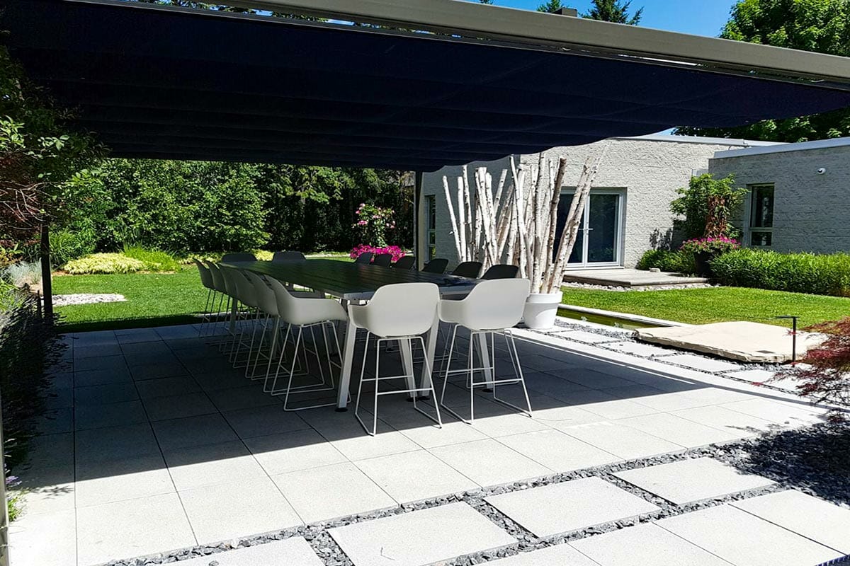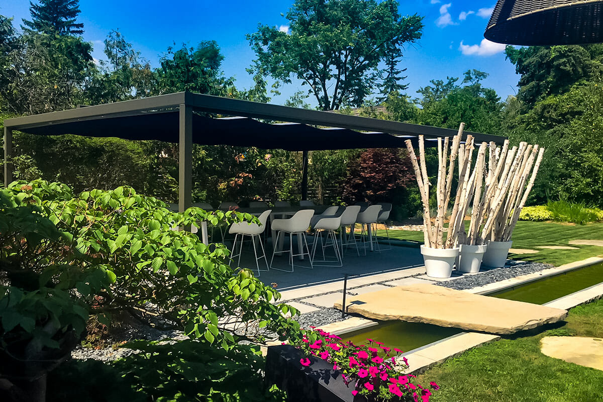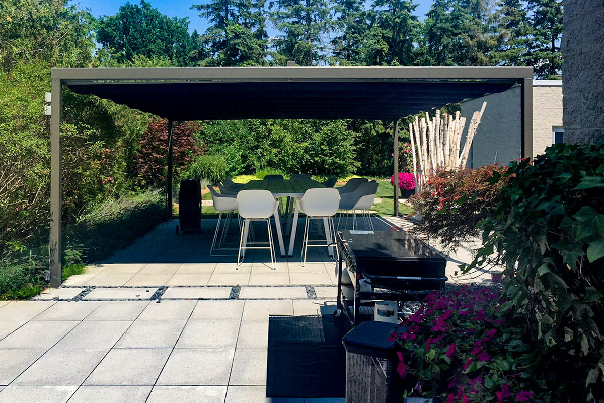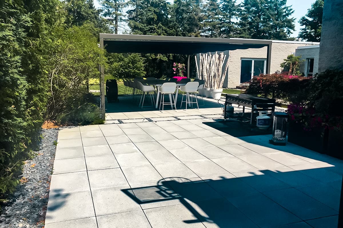 With this Toronto landscaping Project, M.E. Contracting created a breezy, open area while still providing spaces for dining and lounging. A large pergola provides ample space for an outdoor dining area. A water feature separates it from the rest of the lawn and interlocking provides a pathway from the back of the home. A stone slab was used as a bridge over the water feature.